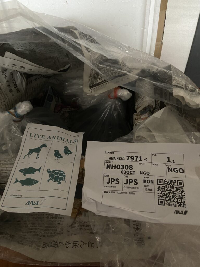 charmさんから機材が届く前に沖縄からANAに乗って来てくれた子達が朝8:30に到着、まだ水槽がないので元気なのを確認してstay